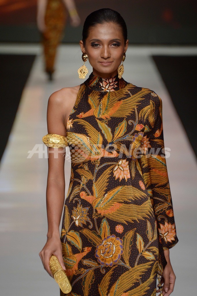 22日に新作を発表したPoppy Dharsonoは、インドネシアの伝統的なテキスタイルでもあるバティックをアレンジしたコレクションを披露した。(c)AFP