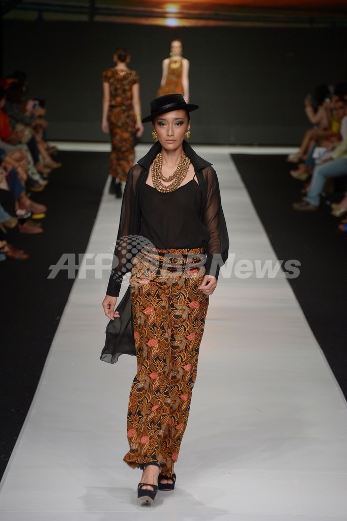 22日に新作を発表したPoppy Dharsonoは、インドネシアの伝統的なテキスタイルでもあるバティックをアレンジしたコレクションを披露した。(c)AFP