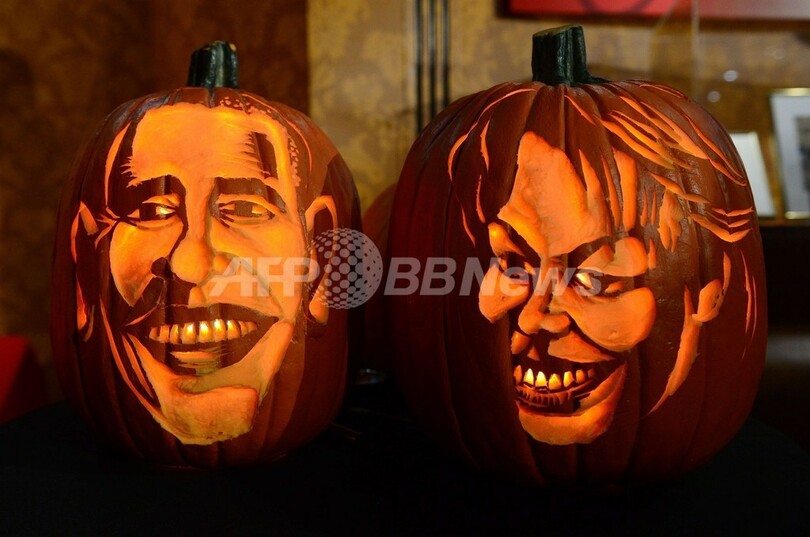 【10月23日 AFP】米ニューヨーク(New York)にあるマダム・タッソー(Madame Tussauds)ろう人形館では、ハロウィーンを間近に控え、世界の有名人たちの似顔絵が彫られたカボチャが展示されている。(c)AFP