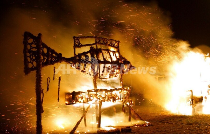 【10月31日 AFP】リトアニア北部パネベジス(Panevezys)近郊のナウジャミエスティス(Naujamiestis)で27日、わらを材料に作り上げられたオブジェを燃やす伝統の祭りが行われ、冬が間近に迫る中、郷愁を誘うこの祭りを見物しようと数千人もの人々が押しかけた。(c)AFP