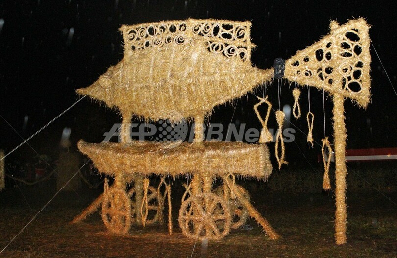 【10月31日 AFP】リトアニア北部パネベジス(Panevezys)近郊のナウジャミエスティス(Naujamiestis)で27日、わらを材料に作り上げられたオブジェを燃やす伝統の祭りが行われ、冬が間近に迫る中、郷愁を誘うこの祭りを見物しようと数千人もの人々が押しかけた。(c)AFP