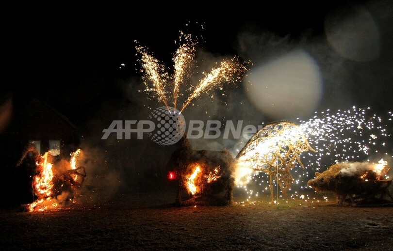 【10月31日 AFP】リトアニア北部パネベジス(Panevezys)近郊のナウジャミエスティス(Naujamiestis)で27日、わらを材料に作り上げられたオブジェを燃やす伝統の祭りが行われ、冬が間近に迫る中、郷愁を誘うこの祭りを見物しようと数千人もの人々が押しかけた。(c)AFP