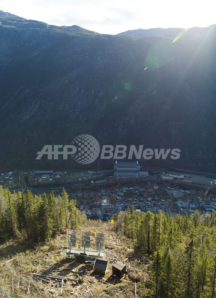 【10月31日 AFP】ノルウェーの山村リューカン(Rjukan)の冬は、周囲の山々が太陽の光を遮るため、住民たちは昼間から薄暗い生活を強いられてきた。しかし10月末からは、山頂に設置された巨大な3枚の鏡が太陽光を反射し、村内に自然光が差し込むようになっている。鏡を山頂に設置する発想は約100年前に考案されたもので、ようやく現実のものとなった。(c)AFP
