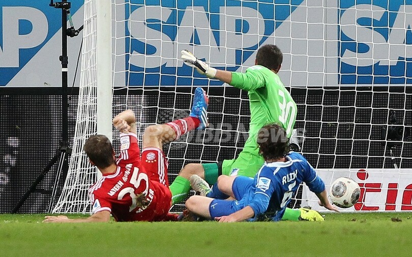 後半30分にバイエルンは、ホッフェンハイムのゴール前に攻め込み立て続けにシュートを放つと、最後はトーマス・ミュラー(Thomas Mueller)が決勝ゴールを決めた。