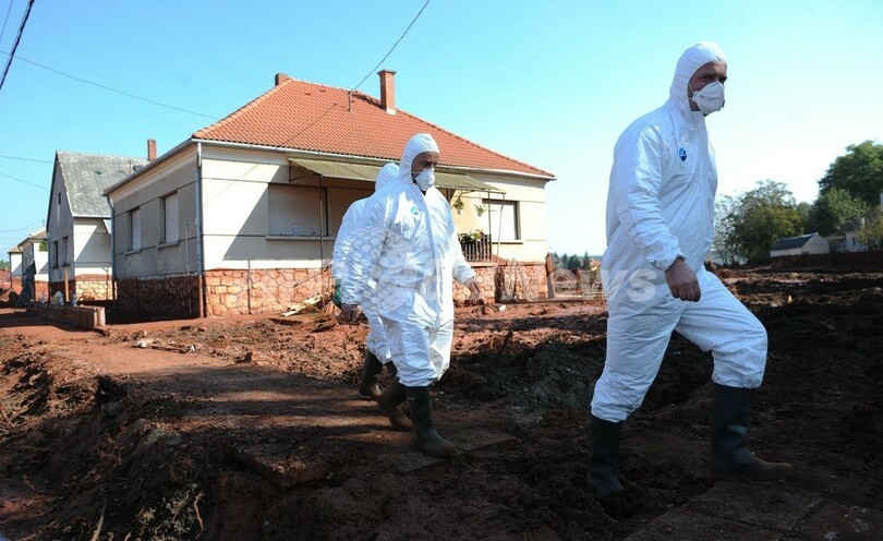 事故は2010年10月4日に発生。110万立方メートルの悪臭を放つ有毒な泥が貯水池の壁を破って流出し、死者10人と負傷者約150人を出し、数百人が家を失った。汚泥が流れ込んだ近くの河川ではほぼ全ての生物が死滅し、汚泥はドナウ川にも達するなど、ハンガリー史上最悪の環境汚染事故となった。(c)AFP