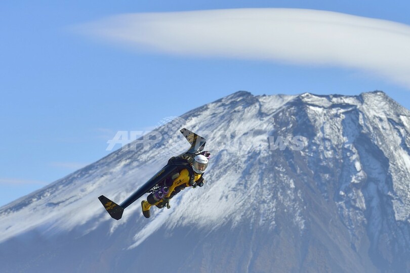 【11月6日 AFP】元戦闘機パイロットのスイス人冒険家、イブ・ロッシー(Yves Rossy)さんが、ジェットパック(ジェットエンジン付きの翼)を背負って富士山(Mt. Fuji)を飛んだ。「ジェットマン(Jetman)」の異名をもつロッシーさんは、重さ60キロのジェットパックを背負い、1週間で富士山の周囲を9周した。(c)AFP