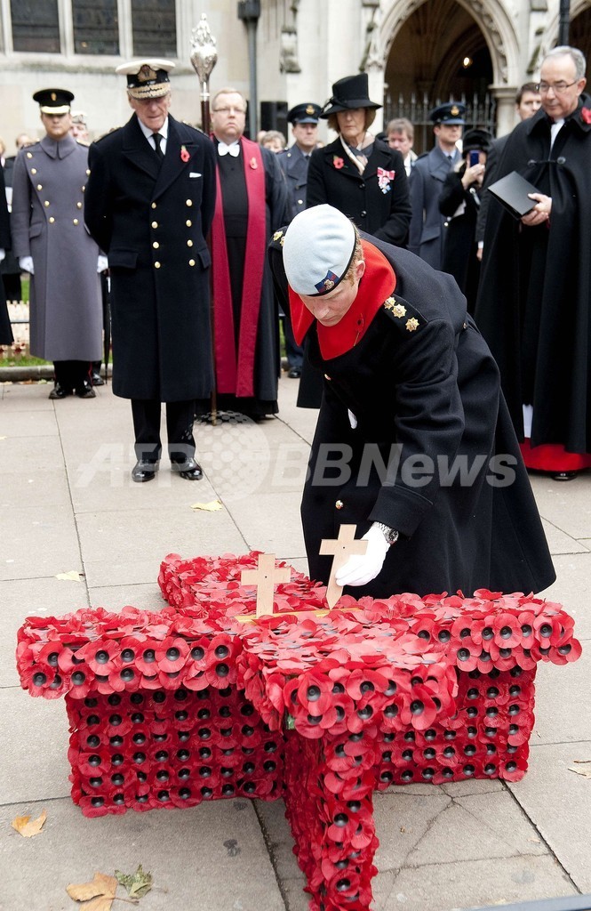 一方、ヘンリー王子とフィリップ殿下は、 ロンドンのウェストミンスター寺院(Westminster Abbey)で行われた式典に出席した。リメンバランス・サンデーは第1次世界大戦の休戦記念日(Armistice Day)に最も近い日曜日で、今年は11月10日に当たる。(c)AFP