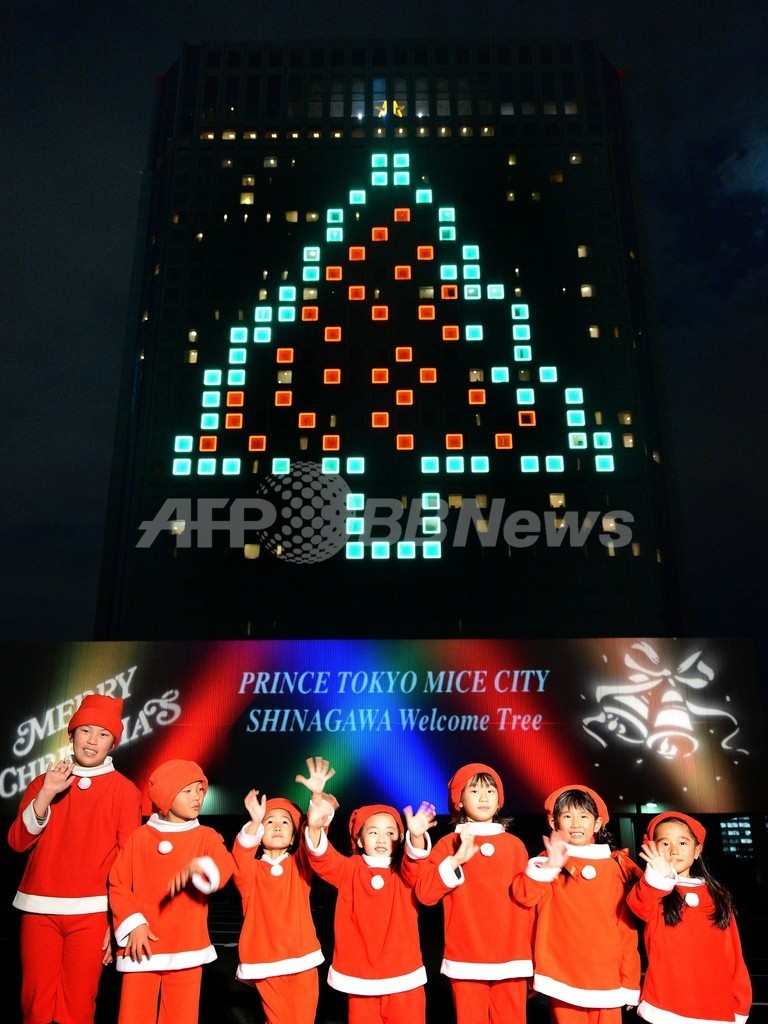 【11月14日 AFP】都内のホテルで13日、クリスマスツリーをかたどった巨大なイルミネーションが点灯した。来月25日のクリスマスまで約4万3500個のLED(発光ダイオード)がホテルの壁面を彩る。(c)AFP