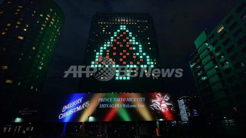 【11月14日 AFP】都内のホテルで13日、クリスマスツリーをかたどった巨大なイルミネーションが点灯した。来月25日のクリスマスまで約4万3500個のLED(発光ダイオード)がホテルの壁面を彩る。(c)AFP