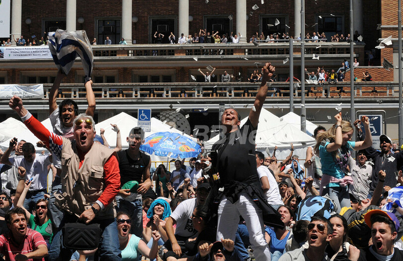 ウルグアイのモンテビデオ(Montevideo)では、巨大スクリーンで試合が中継され、人々がチームの得点に歓喜した。(c)AFP