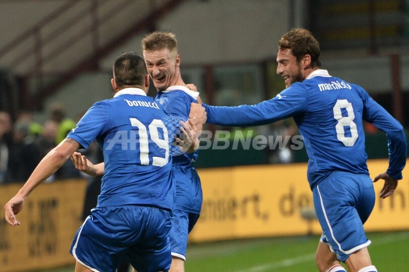 しかしドイツを相手に1995年から続くホームでの無敗記録を守りたいクラウディオ・チェーザレ・プランデッリ(Claudio Cesare Prandelli)監督率いるイタリアは、前半28分にアバーテの活躍で同点に追いついた。(c)AFP