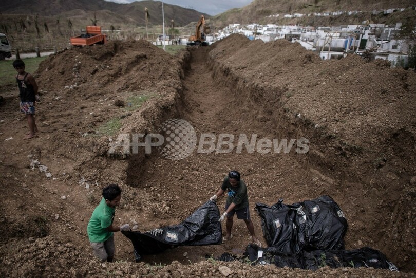 【11月14日 AFP】台風30号(アジア名:ハイエン、Haiyan)がフィリピン中部を襲ってから約1週間が経過した14日、壊滅的な被害を受けた被災地のタクロバン(Tacloban)では犠牲者の遺体が、ようやく集団墓地に埋葬された。