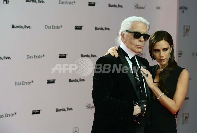 ファッション部門はデザイナーのヴィクトリア・ベッカム(Victoria Beckham)が受賞、カール・ラガーフェルド(Karl Lagerfeld)からトロフィーが手渡された。(c)AFP