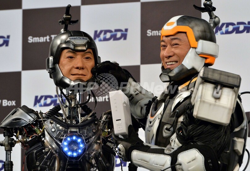 【11月20日 AFP】携帯電話会社KDDIのメディア向けイベントが19日、都内で開催され、ロボットスーツに身を包んだ俳優の松平健(Ken Matsudaira)さんが自分とそっくりなロボット「リアル・アンドロイド・マツケン(Real Android Matsuken)」と対面した。(c)AFP