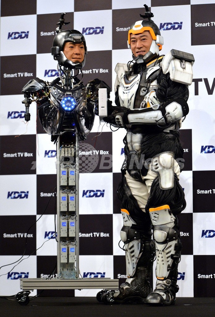 【11月20日 AFP】携帯電話会社KDDIのメディア向けイベントが19日、都内で開催され、ロボットスーツに身を包んだ俳優の松平健(Ken Matsudaira)さんが自分とそっくりなロボット「リアル・アンドロイド・マツケン(Real Android Matsuken)」と対面した。(c)AFP