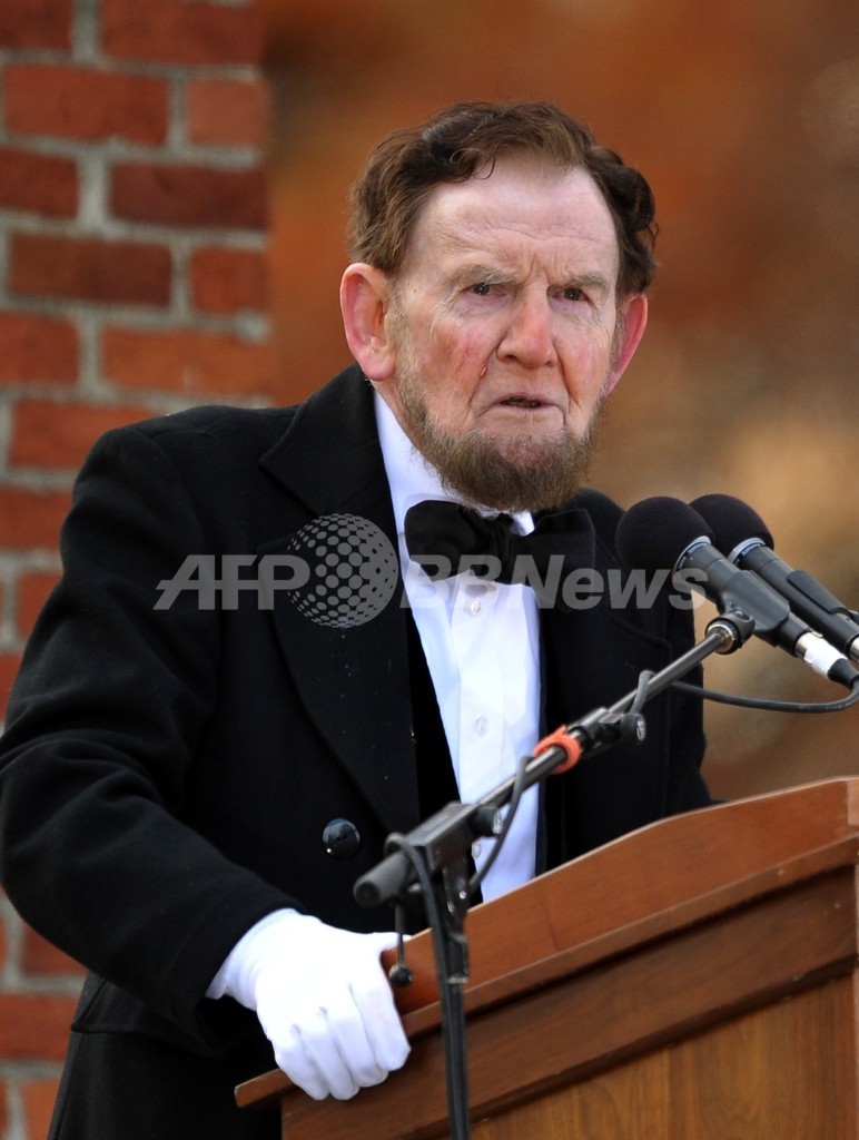 米ペンシルベニア(Pennsylvania)州ゲティスバーグ(Gettysburg)のゲティスバーグ国立軍事公園(Gettysburg National Military Park)で行われた、同国第16代大統領エーブラハム・リンカーン(Abraham Lincoln)による「ゲティスバーグ演説(Gettysburg Address)」の150周年記念式典で、当時の演説の様子を再現する元大統領にふんしたジェームズ・ゲッティ(James Getty)さん(2013年11月19日撮影)。(c)AFP/Mandel NGAN