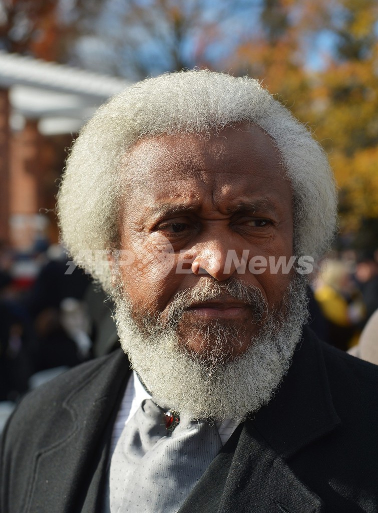 米ペンシルベニア(Pennsylvania)州ゲティスバーグ(Gettysburg)のゲティスバーグ国立軍事公園(Gettysburg National Military Park)で行われた、同国第16代大統領エーブラハム・リンカーン(Abraham Lincoln)による「ゲティスバーグ演説(Gettysburg Address)」の150周年記念式典で、フレデリック・ダグラス(Frederick Douglass)にふんしたマイケル・クラッチャー(Michael Crutcher)さん(2013年11月19日撮影)。(c)AFP/Mandel NGAN