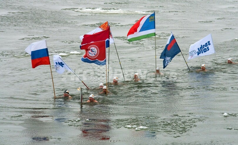 【11月20日 AFP】2014年ソチ冬季五輪を前に、ロシア・モスクワ(Moscow)から5600キロメートル東の位置にあるブラゴヴェシチェンスク(Blagovenshchensk)で聖火リレーが行われ、聖火トーチを持った参加者らがアムール川(Amur River)で寒中水泳を行った。(c)AFP