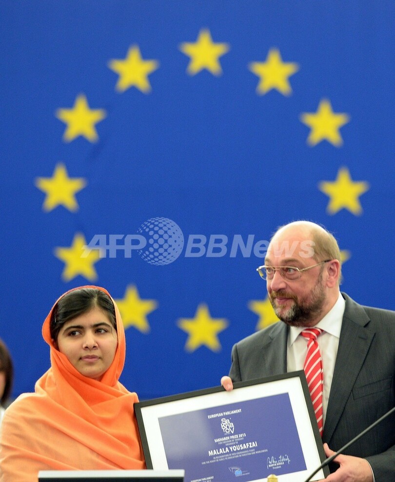 【11月21日 AFP】人権擁護活動で貢献があった人物や団体に贈られる欧州議会(European Parliament)のサハロフ賞(Sakharov Prize)の授賞式が20日、フランス・ストラスブール(Strasbourg)で行われ、全ての子どもたちへの教育の権利を訴えるパキスタンのマララ・ユスフザイ(Malala Yousafzai)さんが賞を受け取った。