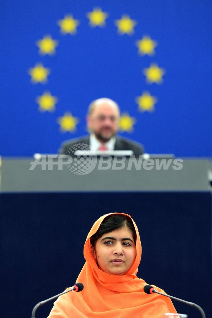 【11月21日 AFP】人権擁護活動で貢献があった人物や団体に贈られる欧州議会(European Parliament)のサハロフ賞(Sakharov Prize)の授賞式が20日、フランス・ストラスブール(Strasbourg)で行われ、全ての子どもたちへの教育の権利を訴えるパキスタンのマララ・ユスフザイ(Malala Yousafzai)さんが賞を受け取った。