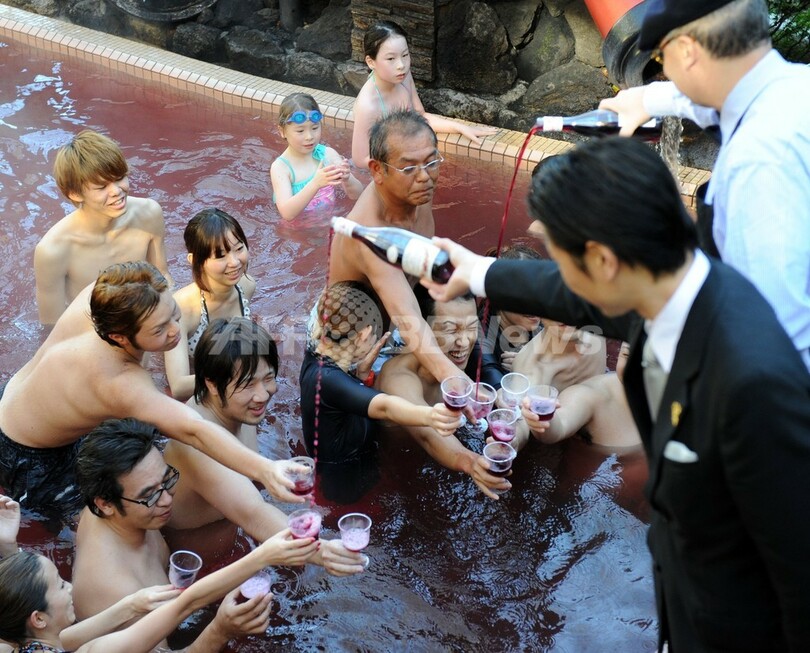 【11月21日 AFP】神奈川県箱根町の温泉テーマパーク「箱根小涌園ユネッサン(Hakone Kowakien Yunessun)」で21日、2013年の「ボージョレ・ヌーボー(Beaujolais Nouveau)」解禁を祝い「ボージョレ・ヌーボー風呂」が始まった。毎年恒例の10日間限定イベントで、この日は仏ブルゴーニュ(Burgundy)のワインメーカー「ラブレ・ロワ(Laboure-Roi)」社のティボー・ガラン(Thibault Garin)副社長も訪れ、温泉客に初物ワインを振る舞った。(c)AFP
