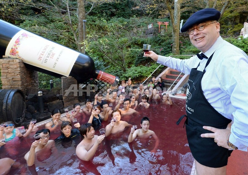 【11月21日 AFP】神奈川県箱根町の温泉テーマパーク「箱根小涌園ユネッサン(Hakone Kowakien Yunessun)」で21日、2013年の「ボージョレ・ヌーボー(Beaujolais Nouveau)」解禁を祝い「ボージョレ・ヌーボー風呂」が始まった。毎年恒例の10日間限定イベントで、この日は仏ブルゴーニュ(Burgundy)のワインメーカー「ラブレ・ロワ(Laboure-Roi)」社のティボー・ガラン(Thibault Garin)副社長も訪れ、温泉客に初物ワインを振る舞った。(c)AFP