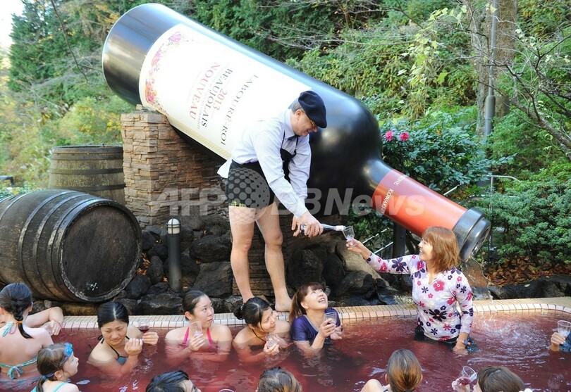 【11月21日 AFP】神奈川県箱根町の温泉テーマパーク「箱根小涌園ユネッサン(Hakone Kowakien Yunessun)」で21日、2013年の「ボージョレ・ヌーボー(Beaujolais Nouveau)」解禁を祝い「ボージョレ・ヌーボー風呂」が始まった。毎年恒例の10日間限定イベントで、この日は仏ブルゴーニュ(Burgundy)のワインメーカー「ラブレ・ロワ(Laboure-Roi)」社のティボー・ガラン(Thibault Garin)副社長も訪れ、温泉客に初物ワインを振る舞った。(c)AFP