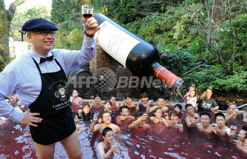 【11月21日 AFP】神奈川県箱根町の温泉テーマパーク「箱根小涌園ユネッサン(Hakone Kowakien Yunessun)」で21日、2013年の「ボージョレ・ヌーボー(Beaujolais Nouveau)」解禁を祝い「ボージョレ・ヌーボー風呂」が始まった。毎年恒例の10日間限定イベントで、この日は仏ブルゴーニュ(Burgundy)のワインメーカー「ラブレ・ロワ(Laboure-Roi)」社のティボー・ガラン(Thibault Garin)副社長も訪れ、温泉客に初物ワインを振る舞った。(c)AFP