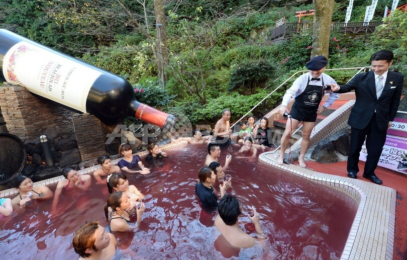 【11月21日 AFP】神奈川県箱根町の温泉テーマパーク「箱根小涌園ユネッサン(Hakone Kowakien Yunessun)」で21日、2013年の「ボージョレ・ヌーボー(Beaujolais Nouveau)」解禁を祝い「ボージョレ・ヌーボー風呂」が始まった。毎年恒例の10日間限定イベントで、この日は仏ブルゴーニュ(Burgundy)のワインメーカー「ラブレ・ロワ(Laboure-Roi)」社のティボー・ガラン(Thibault Garin)副社長も訪れ、温泉客に初物ワインを振る舞った。(c)AFP