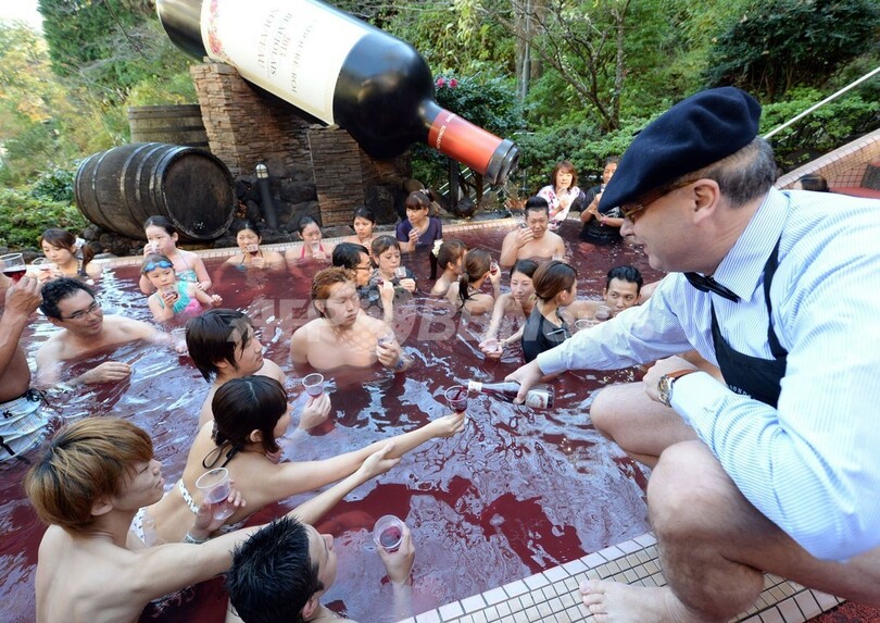 【11月21日 AFP】神奈川県箱根町の温泉テーマパーク「箱根小涌園ユネッサン(Hakone Kowakien Yunessun)」で21日、2013年の「ボージョレ・ヌーボー(Beaujolais Nouveau)」解禁を祝い「ボージョレ・ヌーボー風呂」が始まった。毎年恒例の10日間限定イベントで、この日は仏ブルゴーニュ(Burgundy)のワインメーカー「ラブレ・ロワ(Laboure-Roi)」社のティボー・ガラン(Thibault Garin)副社長も訪れ、温泉客に初物ワインを振る舞った。(c)AFP