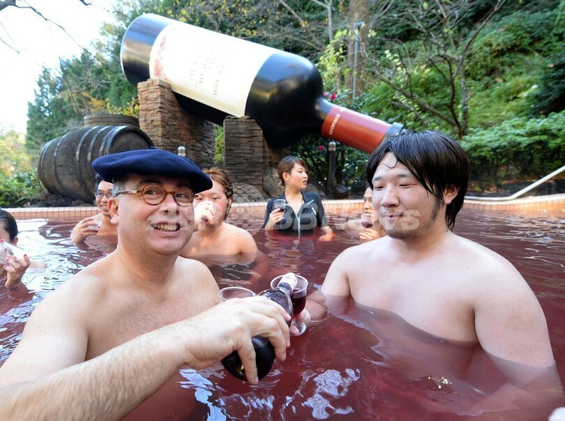 【11月21日 AFP】神奈川県箱根町の温泉テーマパーク「箱根小涌園ユネッサン(Hakone Kowakien Yunessun)」で21日、2013年の「ボージョレ・ヌーボー(Beaujolais Nouveau)」解禁を祝い「ボージョレ・ヌーボー風呂」が始まった。毎年恒例の10日間限定イベントで、この日は仏ブルゴーニュ(Burgundy)のワインメーカー「ラブレ・ロワ(Laboure-Roi)」社のティボー・ガラン(Thibault Garin)副社長も訪れ、温泉客に初物ワインを振る舞った。(c)AFP