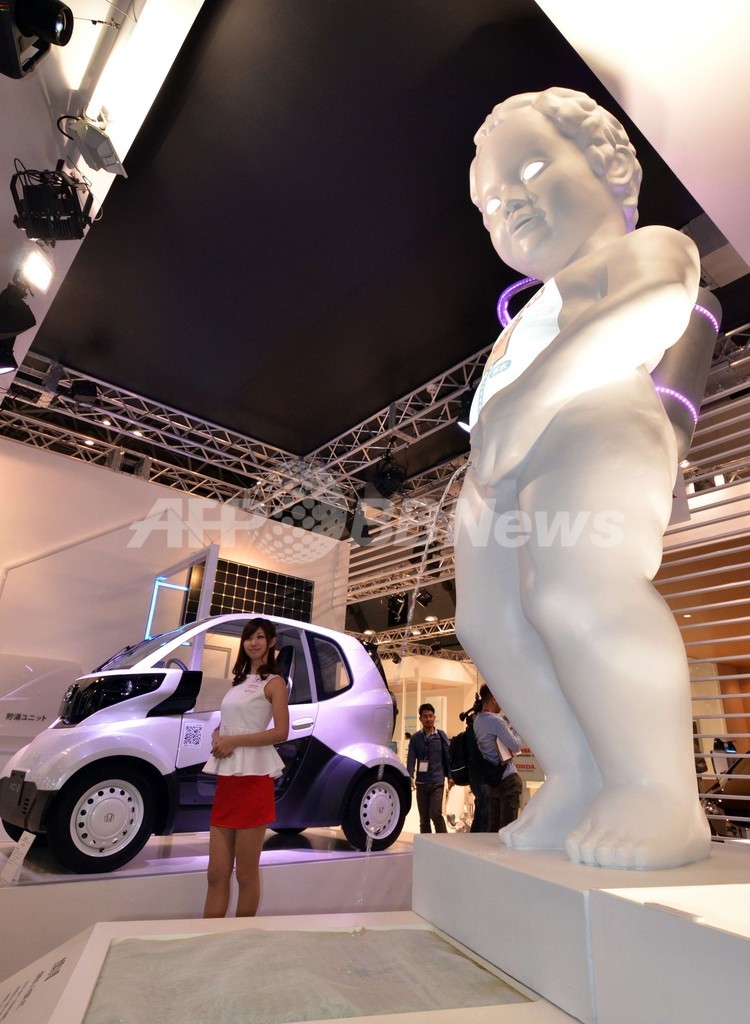 【11月22日 AFP】東京・有明の東京ビッグサイト(Tokyo Big Sight)で開催中の「第43回東京モーターショー(Tokyo Motor Show)2013」に、水素タンクを背負った高さ2メートルの巨大な小便小僧ならぬ「水素小僧」が出現した。