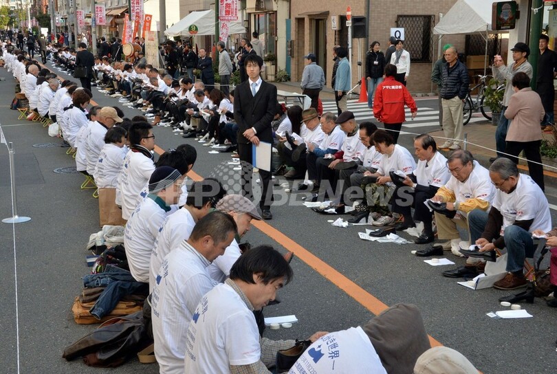 【11月23日 AFP】靴メーカーなど靴関連会社が多いことで知られる東京都台東区のアサヒ商店街(Asahi Shopping Street)で22日、800人余りが参加して一斉に靴を磨く人数のギネス世界記録(Guinness World Records)の更新に挑戦した。2011年にアラブ首長国連邦で打ち立てられたこれまでの記録(451人)を破り、見事に新記録を達成した。(c)AFP