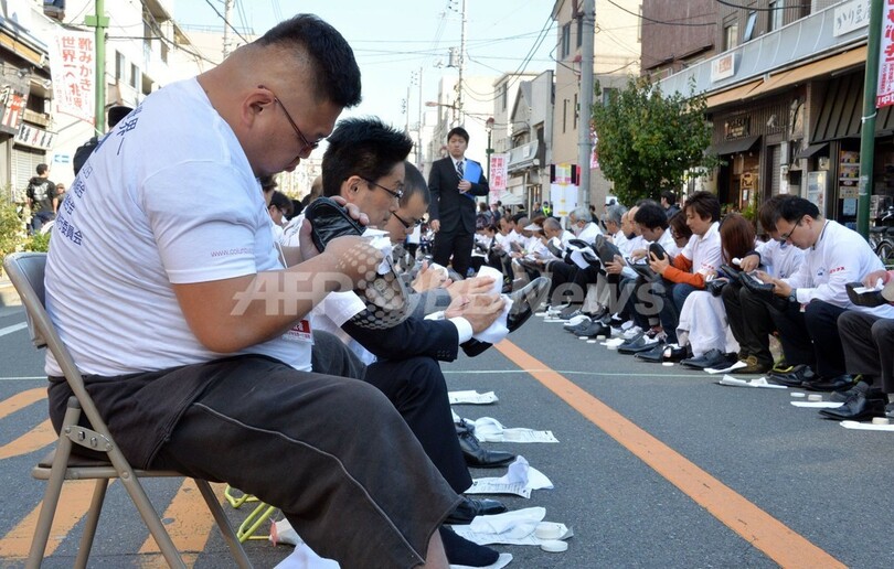 【11月23日 AFP】靴メーカーなど靴関連会社が多いことで知られる東京都台東区のアサヒ商店街(Asahi Shopping Street)で22日、800人余りが参加して一斉に靴を磨く人数のギネス世界記録(Guinness World Records)の更新に挑戦した。2011年にアラブ首長国連邦で打ち立てられたこれまでの記録(451人)を破り、見事に新記録を達成した。(c)AFP