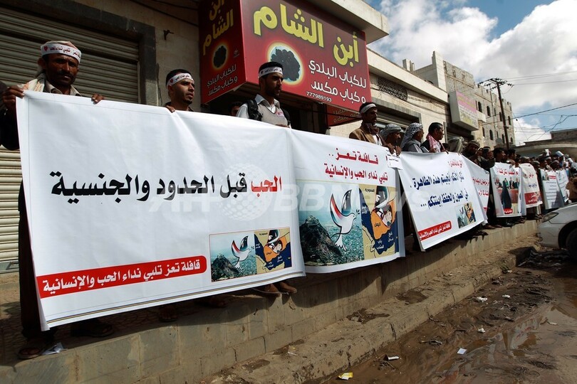 ニランさんが出廷した首都サナア(Sanaa)の裁判所前では、「私たちは皆フダだ」と書かれたハチマキを巻いた支持者らがデモを行った。