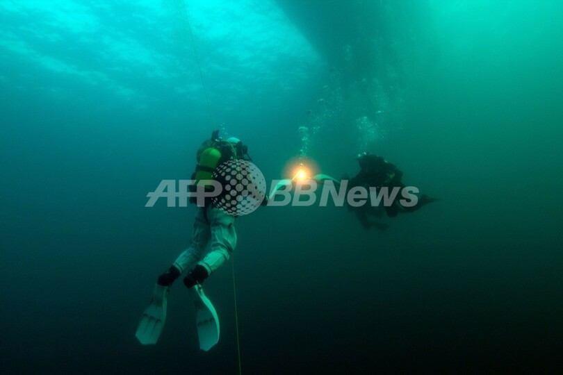 耐水加工が施された特別なトーチに聖火が灯され、ダイバーがそれを持ってバイカル湖の水中に潜った。深い水の中でピンク色にきらめきく聖火の様子は、ロシアでテレビ中継された。(c)AFP