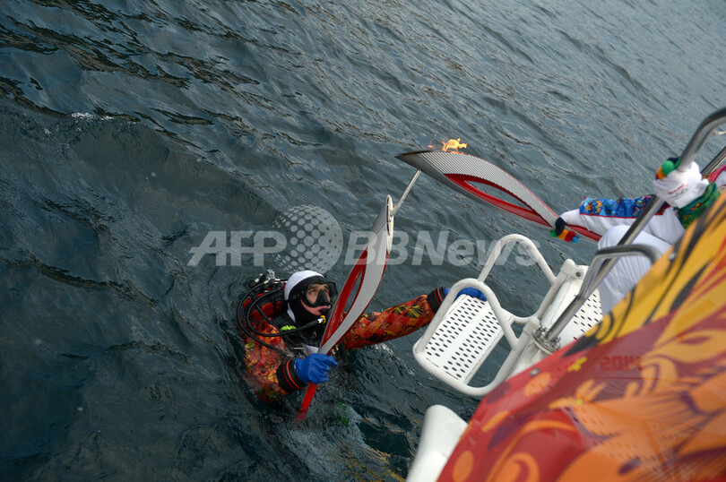 耐水加工が施された特別なトーチに聖火が灯され、ダイバーがそれを持ってバイカル湖の水中に潜った。深い水の中でピンク色にきらめきく聖火の様子は、ロシアでテレビ中継された。(c)AFP