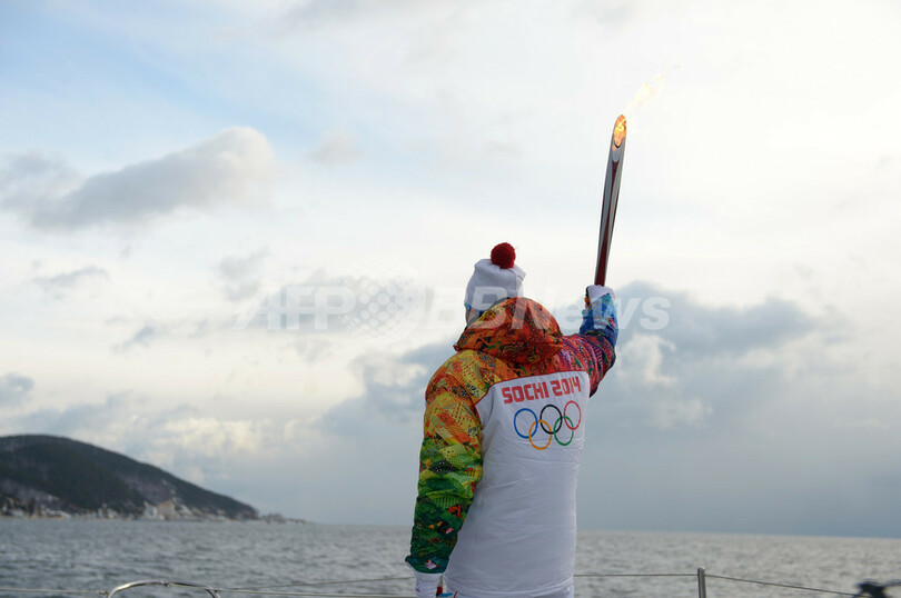 耐水加工が施された特別なトーチに聖火が灯され、ダイバーがそれを持ってバイカル湖の水中に潜った。深い水の中でピンク色にきらめきく聖火の様子は、ロシアでテレビ中継された。(c)AFP