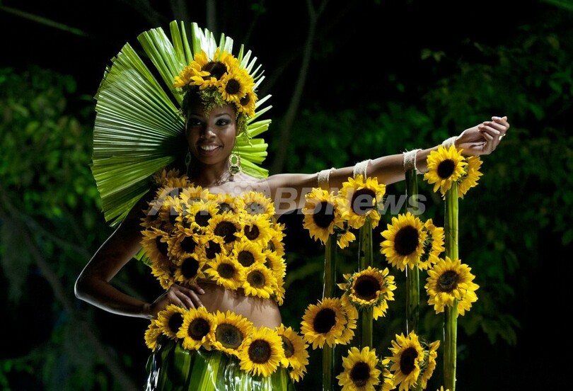 【12月2日 AFP】コロンビアのバジェデルカウカ(Valle del Cauca)県にあるカリ(Cali)で11月30日、「バイオファッション(BioFashion)2013」と題されたファッションショーが開催された。今回で7回目を数えるバイオファッションは、環境保護への意識を高めていくことを意図して、草や花、葉や枝といった自然の素材でつくられたデザインを取り入れた服が披露される。(c)AFP