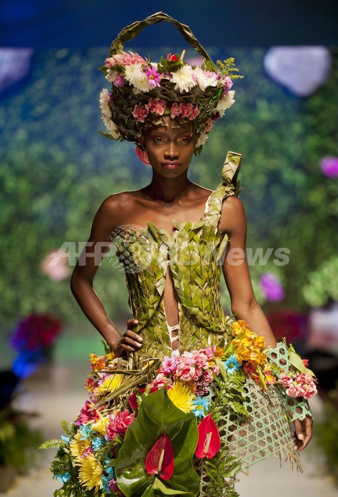 【12月2日 AFP】コロンビアのバジェデルカウカ(Valle del Cauca)県にあるカリ(Cali)で11月30日、「バイオファッション(BioFashion)2013」と題されたファッションショーが開催された。今回で7回目を数えるバイオファッションは、環境保護への意識を高めていくことを意図して、草や花、葉や枝といった自然の素材でつくられたデザインを取り入れた服が披露される。(c)AFP