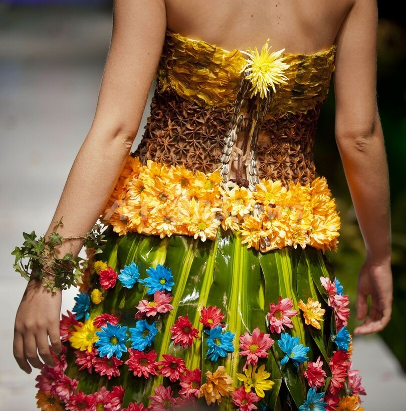 【12月2日 AFP】コロンビアのバジェデルカウカ(Valle del Cauca)県にあるカリ(Cali)で11月30日、「バイオファッション(BioFashion)2013」と題されたファッションショーが開催された。今回で7回目を数えるバイオファッションは、環境保護への意識を高めていくことを意図して、草や花、葉や枝といった自然の素材でつくられたデザインを取り入れた服が披露される。(c)AFP