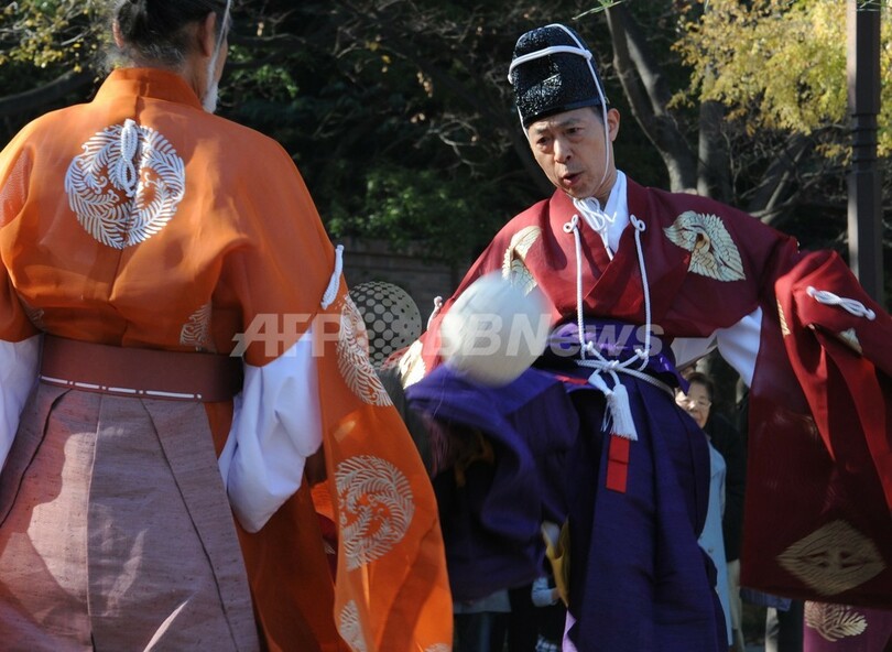 【12月2日 AFP】都内で1日、蹴鞠を披露するイベントが開催された。右足だけを使って球を蹴り上げるこの競技は、7世紀に中国から伝来したとされる。同イベントでは、この競技への理解を深めてもらおうと、京都の蹴鞠保存会の会員たちが装束姿で蹴鞠を実演してみせた。(c)AFP