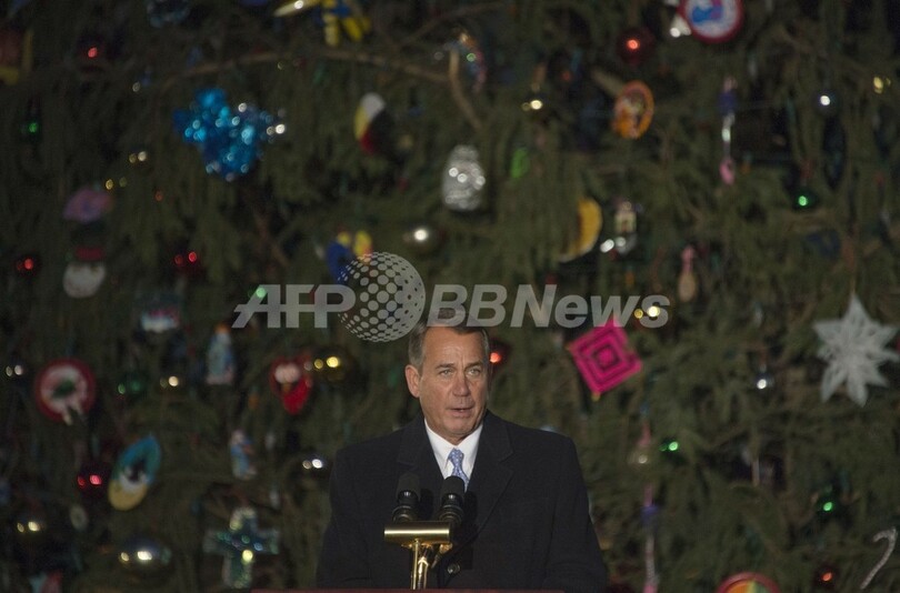【12月4日 AFP】米首都ワシントンD.C.(Washington D.C.)で3日、連邦議会議事堂(US Capitol)のそばに設置されたクリスマスツリーの点灯式が行われた。点灯式には、ジョン・ベイナー(John Boehner)下院議長らが出席した。(c)AFP