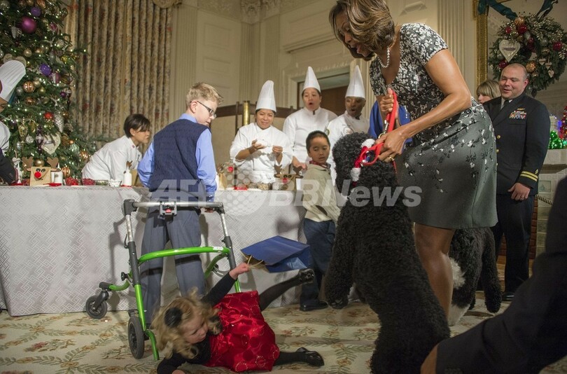【12月5日 AFP】クリスマスの飾り付けのお披露目パーティーが開催されていた米ワシントンD.C.(Washington D.C.)のホワイトハウス(White House)で4日、バラク・オバマ(Barack Obama)米大統領一家の愛犬「サニー(Sunny)」が、出席していた2歳の女の子の目の前で立ち上がり、女の子が尻もちをつくというハプニングがあった。(c)AFP