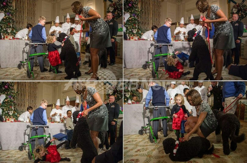 【12月5日 AFP】クリスマスの飾り付けのお披露目パーティーが開催されていた米ワシントンD.C.(Washington D.C.)のホワイトハウス(White House)で4日、バラク・オバマ(Barack Obama)米大統領一家の愛犬「サニー(Sunny)」が、出席していた2歳の女の子の目の前で立ち上がり、女の子が尻もちをつくというハプニングがあった。(c)AFP