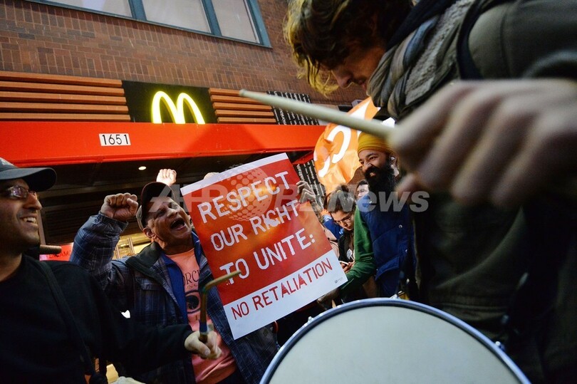 米ファストフード大手の賃金は連邦最低賃金の時給7.25ドル(約740円)が一般的だが、従業員らはこれでは生活が成り立たないとして、時給15ドル(約1500円)への引き上げを要求している。従業員たちは今回の全日ストに先立って、昨年末と今年8月にも賃金引き上げを求める抗議デモを実施している。(c)AFP/Jeremy TORDJMAN