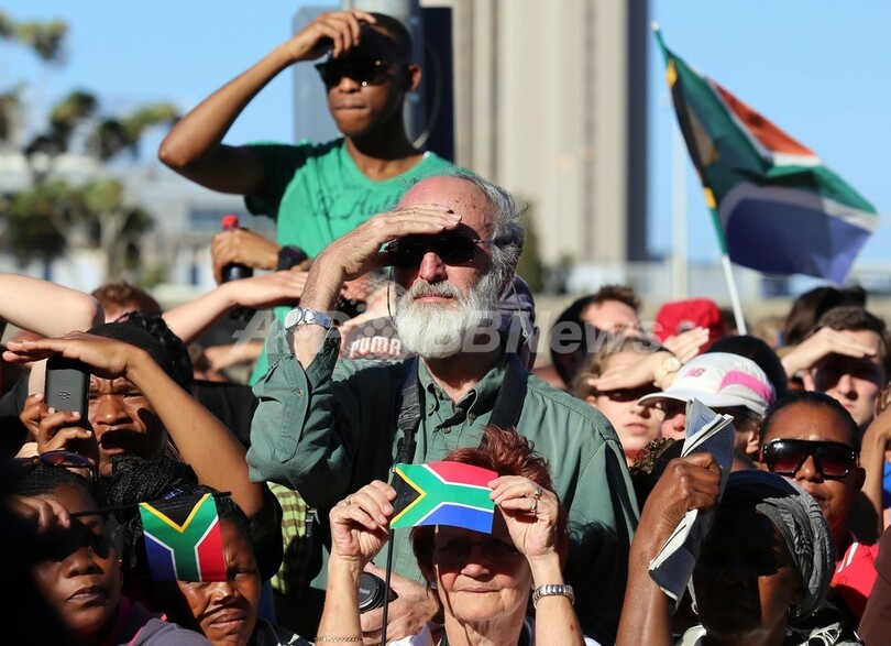 ケープタウン(Cape Town)では、マンデラ氏が30年近い獄中生活の後に初めて演説を行った場所に、あらゆる人種、宗教、年齢の何千人もの群集が集まった。