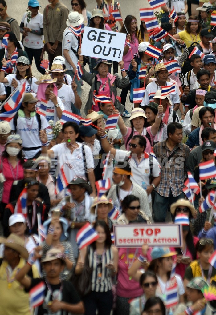 【12月9日 AFP】(一部更新、写真追加)大規模な反政府デモに揺れるタイのインラック・シナワット(Yingluck Shinawatra)首相は9日、下院を解散して総選挙を実施すると発表した。一方、インラック首相の退陣を求める反政府派は同日、首都バンコク(Bangkok)でデモを再開。警察によると参加者は約14万人に上っているという。