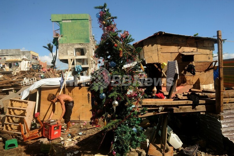 18歳のロニー・メラフロアさんは、竹を使って間に合わせのクリスマスツリーを作った。ツリーは彼と家族が暮らす木造の小屋脇にある割れたコンクリートとタイルのがれきの上に立っている。メラフロアさんは「家の中には置けなかったけど、クリスマスは祝いたい」とコメントした。両親と7人のきょうだいと共に近くの学校に避難して台風の被害を免れたという。