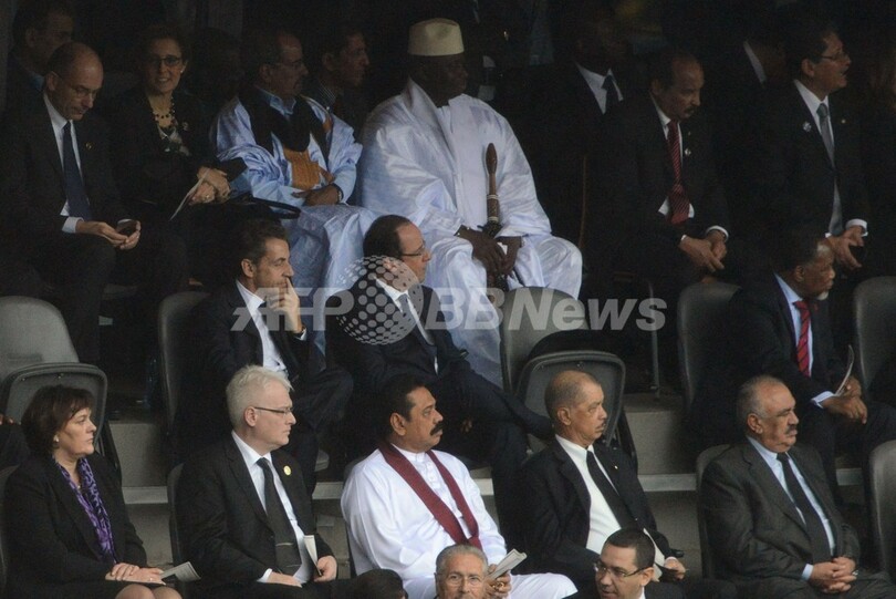 これとは対照的に、オバマ氏の左横に座るミシェル・オバマ(Michelle Obama)米大統領夫人は打ち解けた様子の3首脳には加わらず、5日に95歳で死去した南アフリカの反アパルトヘイトの英雄であるマンデラ元大統領に対し世界の指導者らが追悼の言葉を捧げる演壇の方をじっと見つめていた。